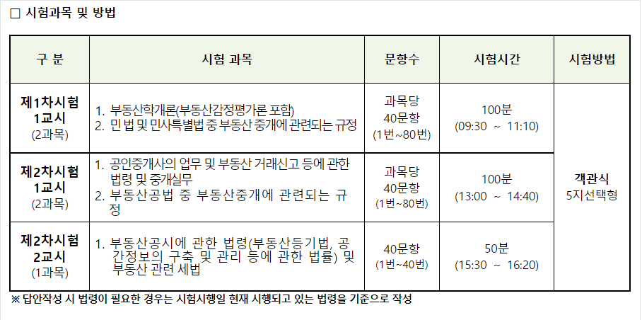 2023년 공인중개사 시험에서는 총 5과목이 출제 됩니다. 문항수는 과목당 40문항 이며 시험 시간은 250분 입니다.