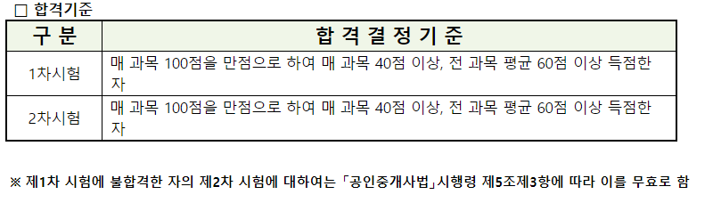 공인중개사 시험의 합격 기준은 매 과목 100점 만점에 매 과목 40점 이상, 전 과목 평균 60점 이상 득점 하여야 합니다.
